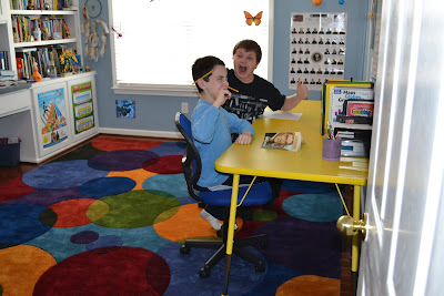 The latest and most colorful development here is a new rug for our school room! Goofy boys are same as in previous posts.